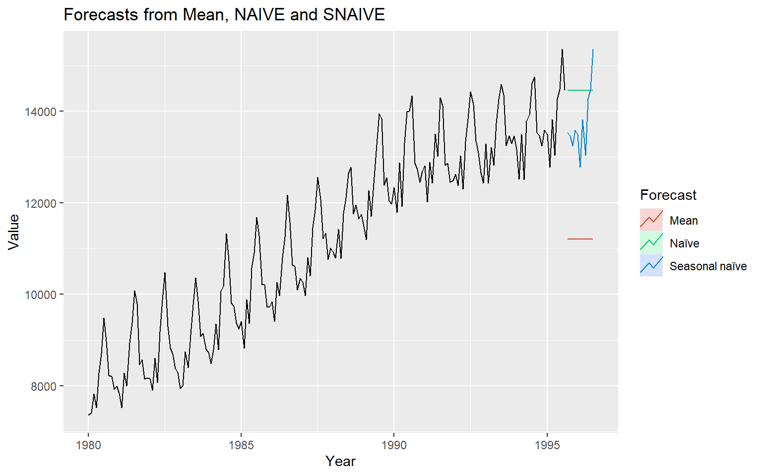 ggtitle("Forecasts from Mean, NAIVE and SNAIVE") +