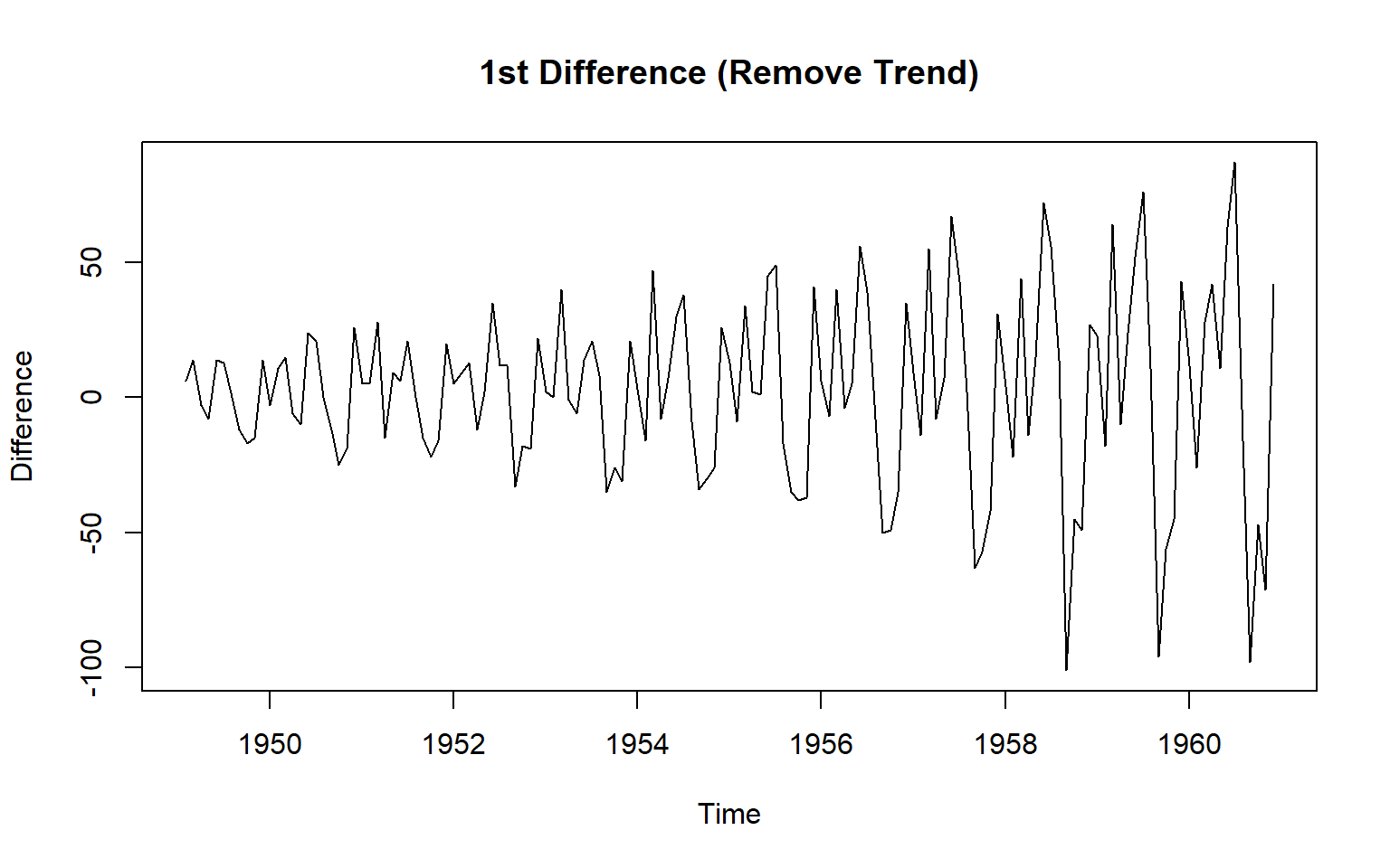 plot(diff1, main = "1st Difference (Remove Trend)", ylab = "Difference")