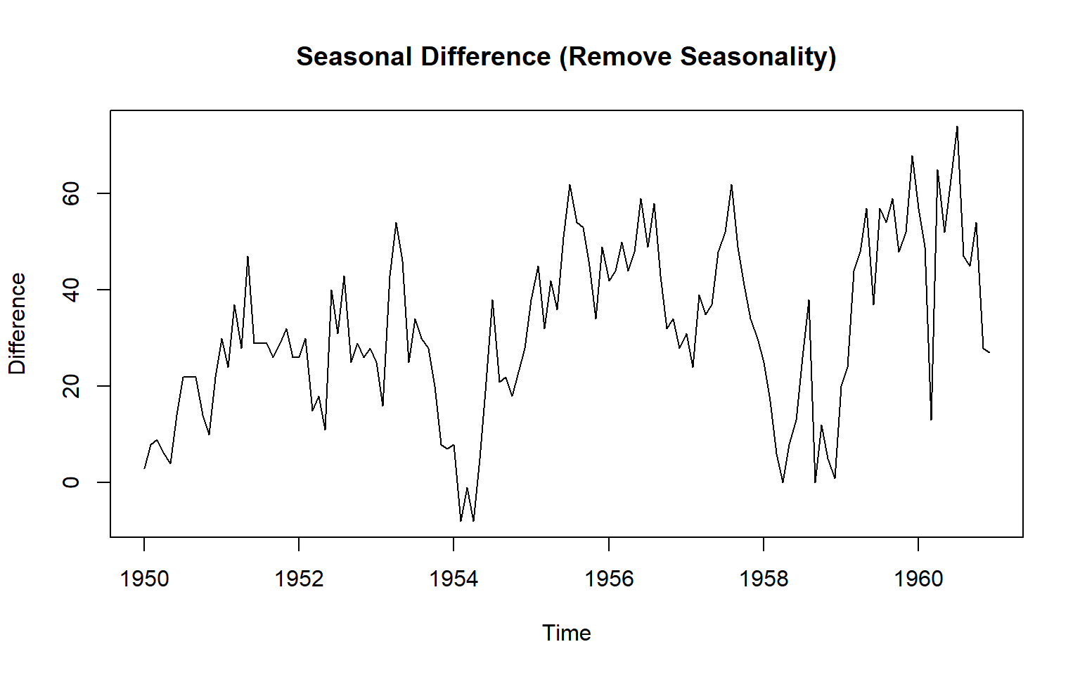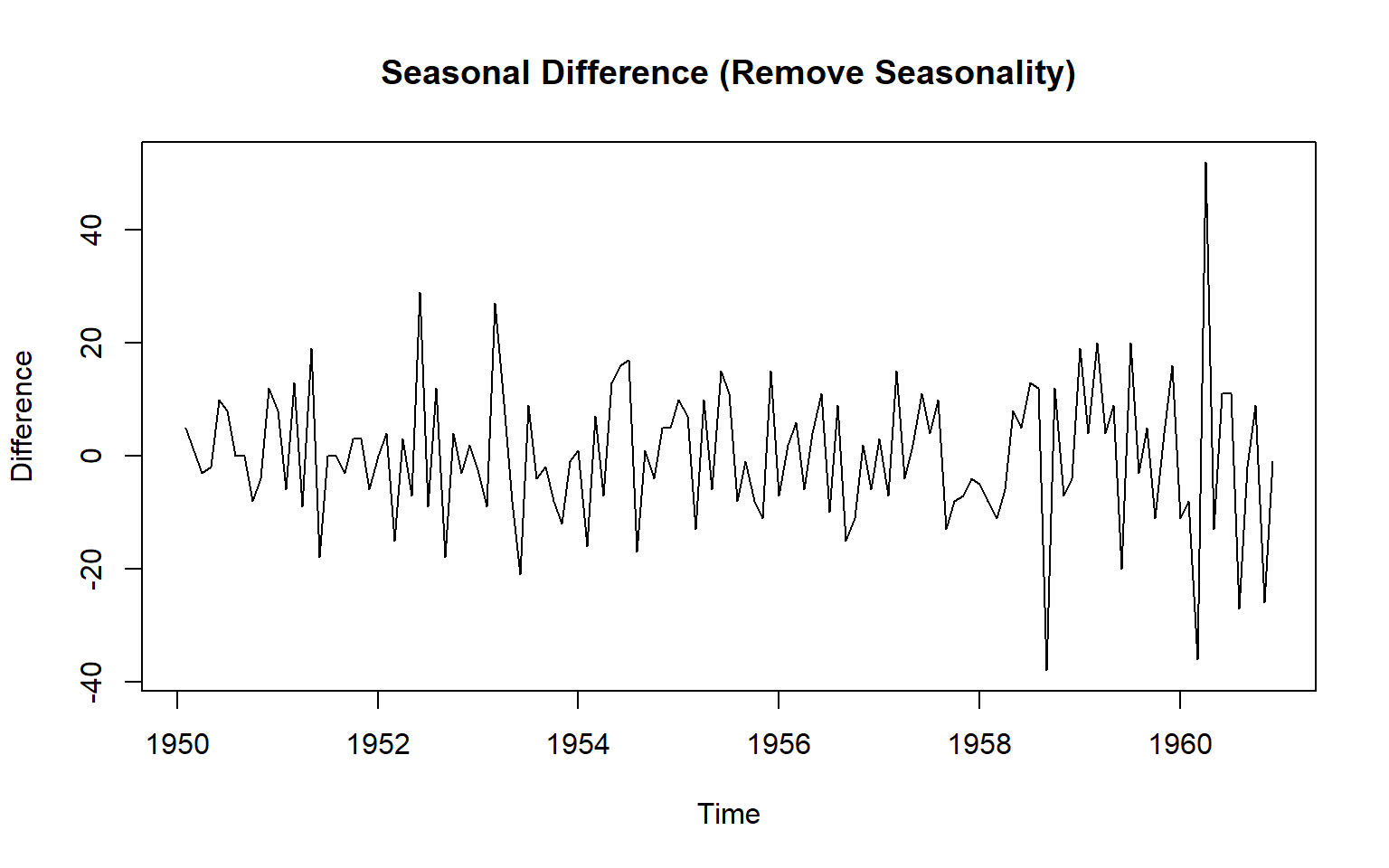 plot(diff_seasonal, main = "Seasonal Difference (Remove Seasonality)", ylab = "Difference")