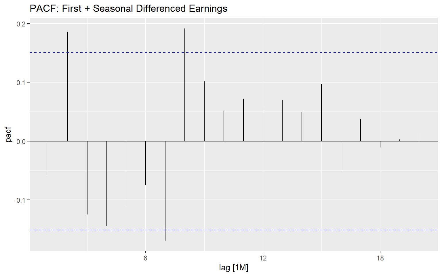 labs(title = "PACF: First + Seasonal Differenced Earnings")