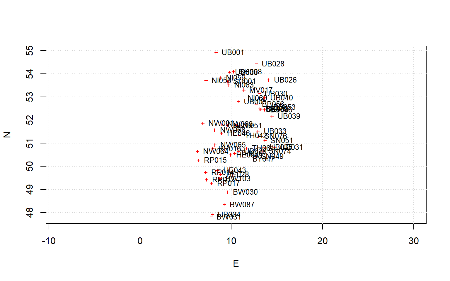 xlab="E", ylab="N")
