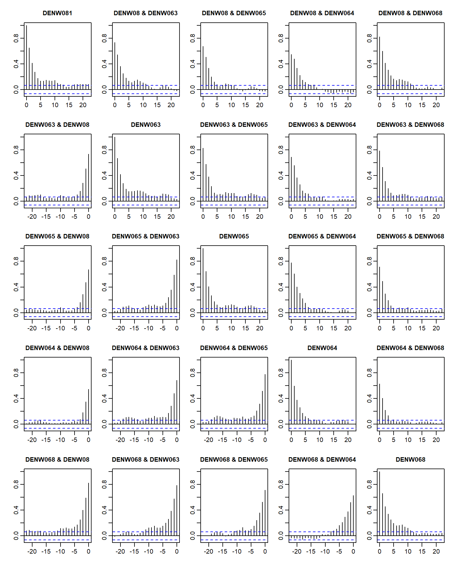 Stations 068 and 081 also have strong lag-0 cross-correlation.