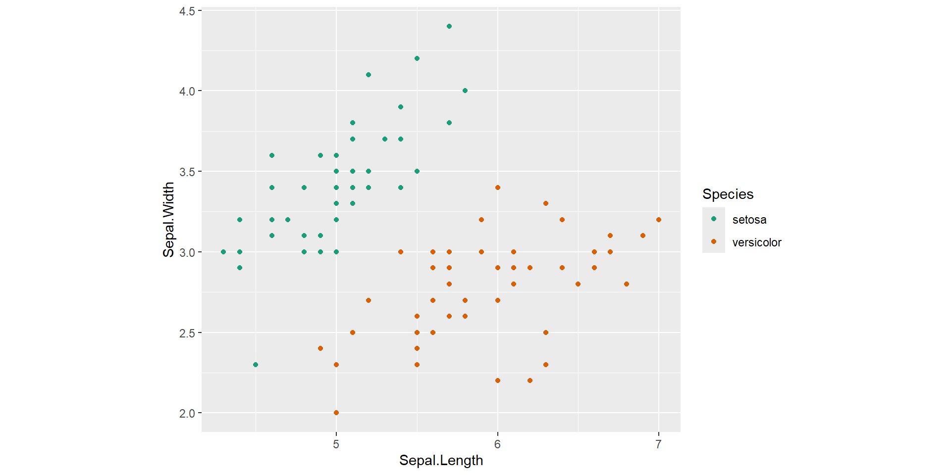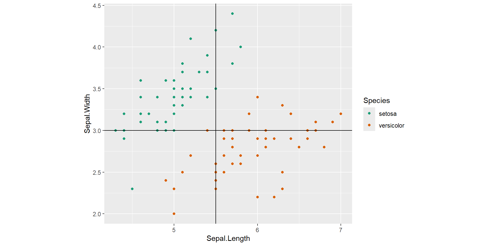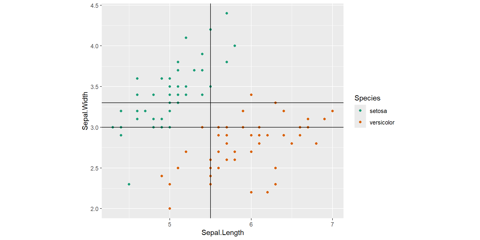 7) Sepal.Width< 3.25 42 0 versicolor (0.00000000 1.00000000) *