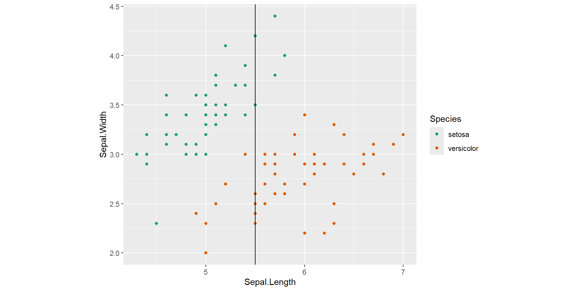3) Sepal.Length>=5.45 49 5 versicolor (0.10204082 0.89795918)