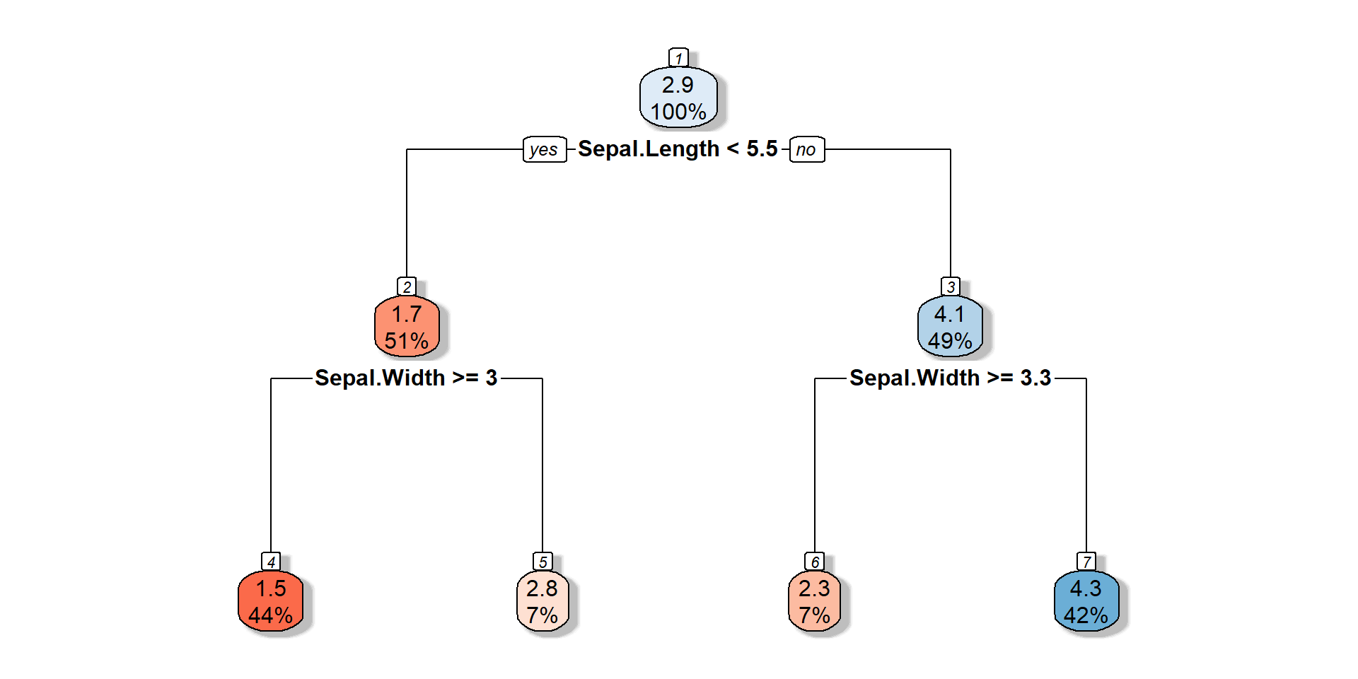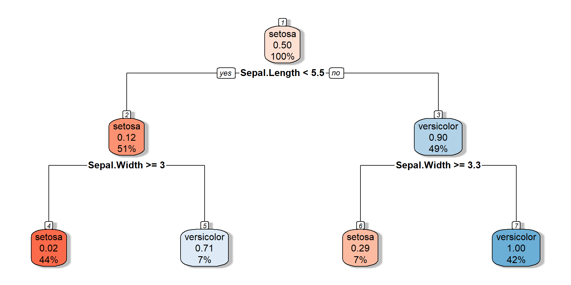 4) Sepal.Width>=2.95 44 1 setosa (0.97727273 0.02272727) *