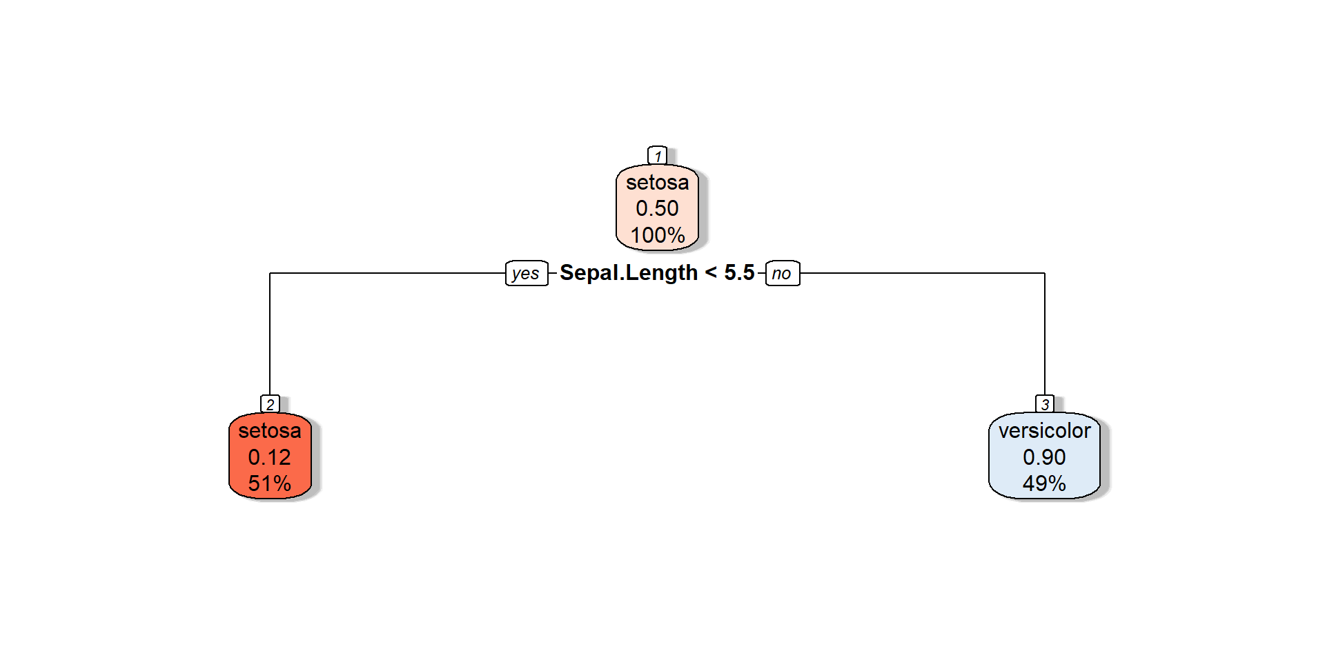1) root 100 50 setosa (0.50000000 0.50000000)