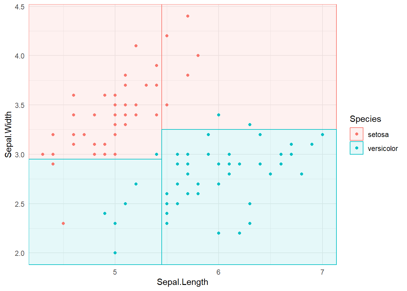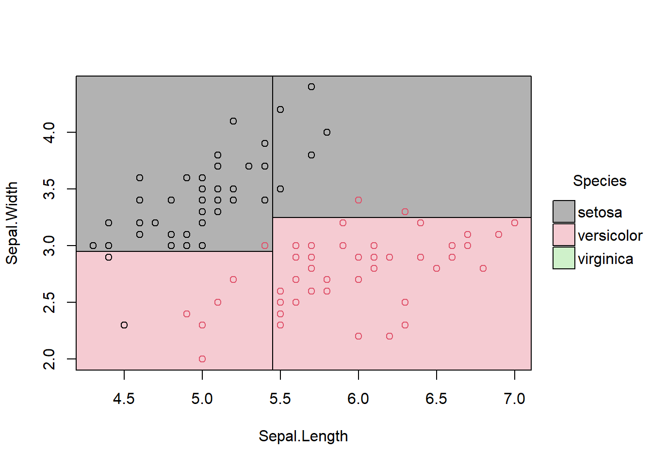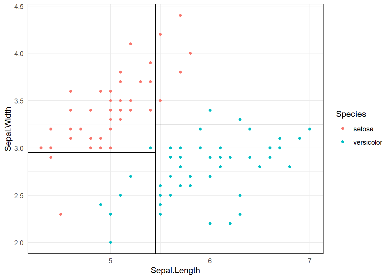 \(R1 = \{X|Sepal.Width >=3, Sepal.Length <5.5 \}\)