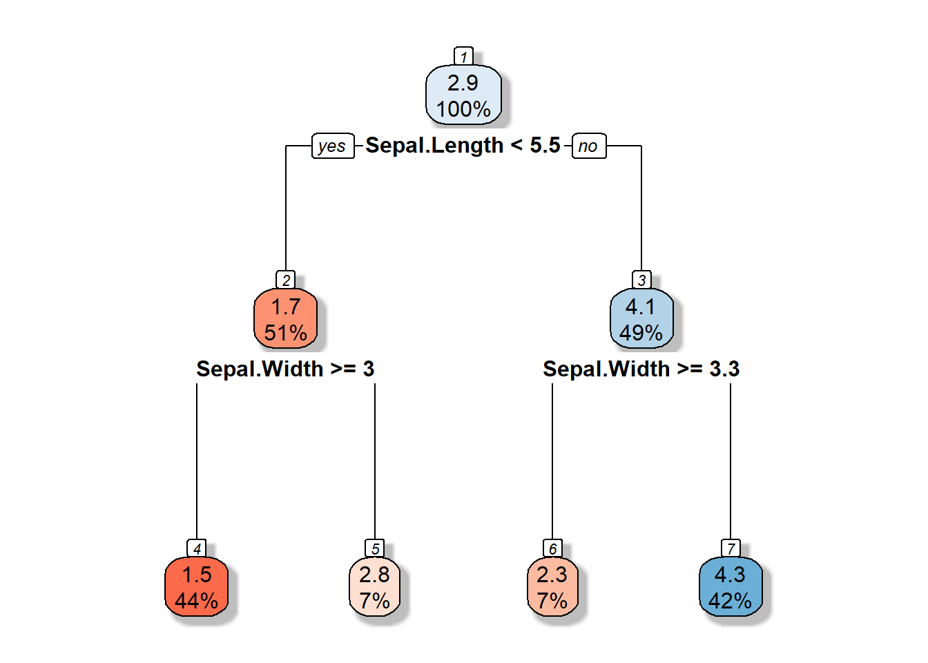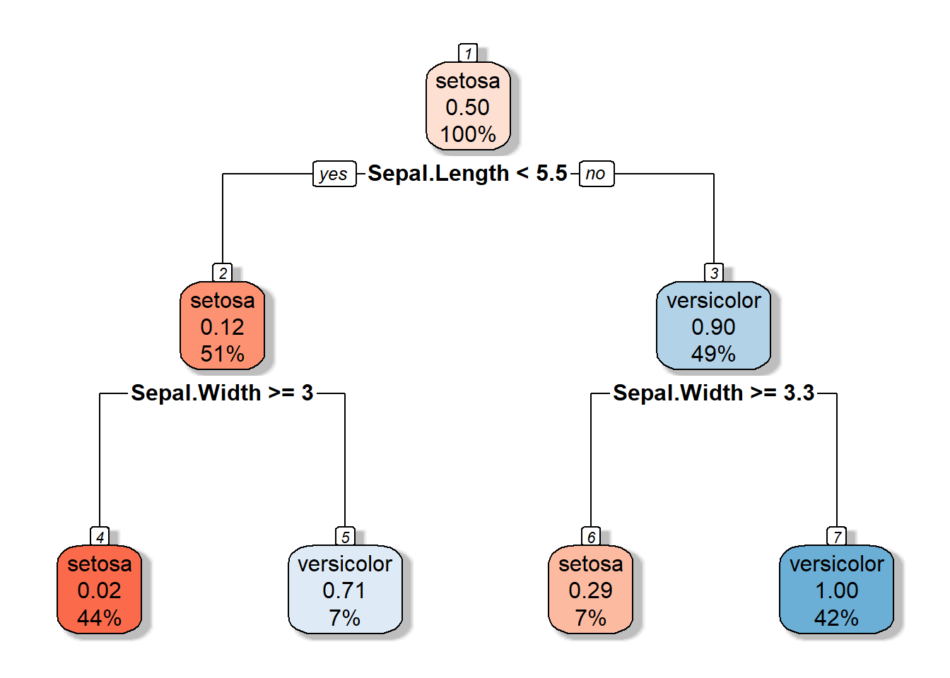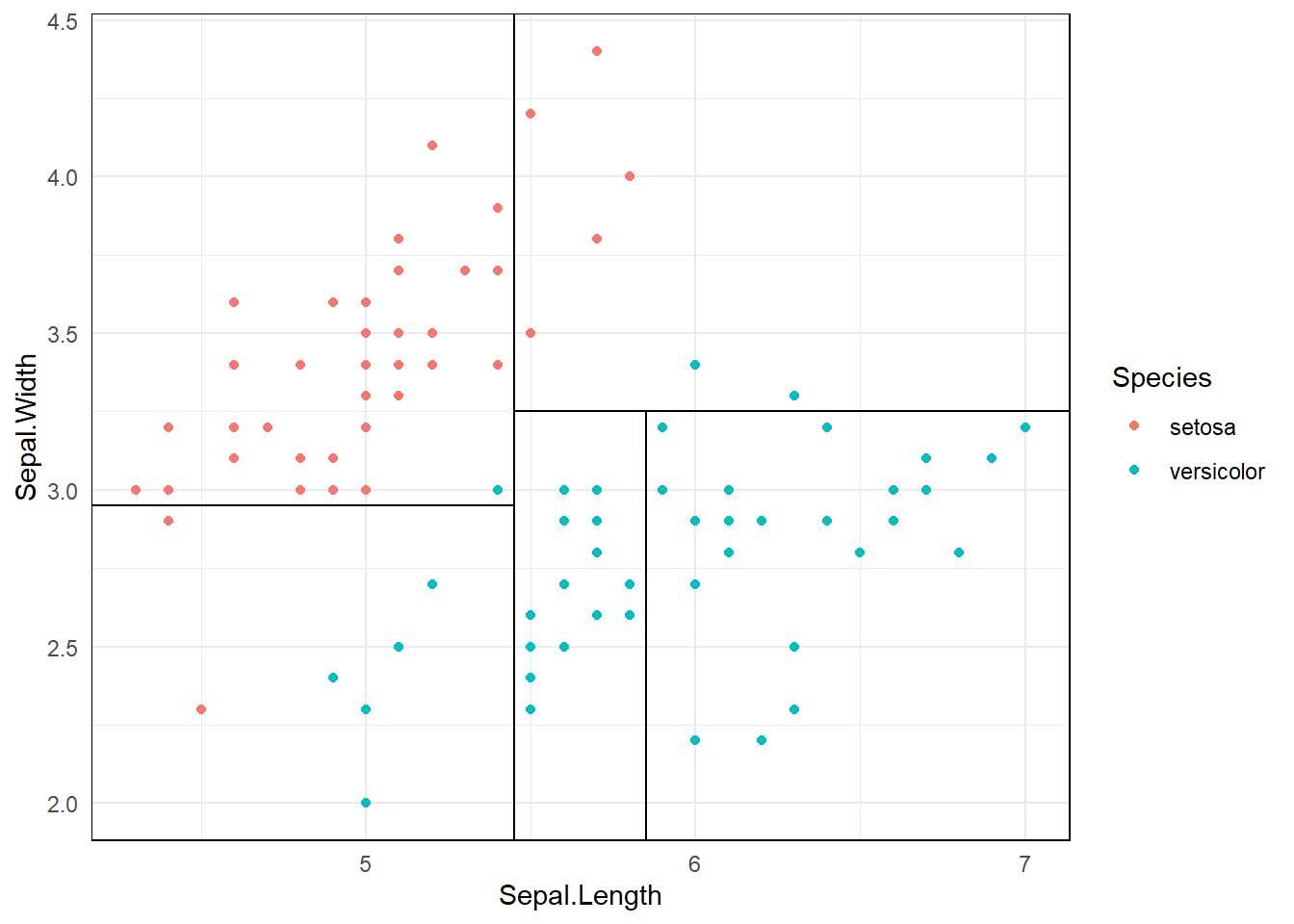 \(R1 = \{X|Sepal.Width >=3, Sepal.Length <5.5 \}\)