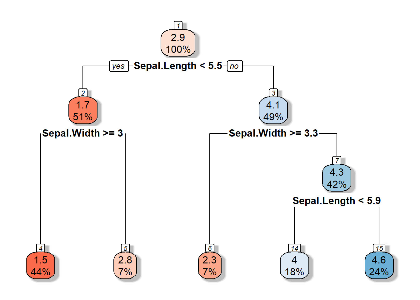 A regression tree predicts a continuous outcome (for example, house price, temperature, or pH level). The goal is to split the data into smaller and smaller groups (nodes) that are as homogeneous as possible with respect to the response variable.