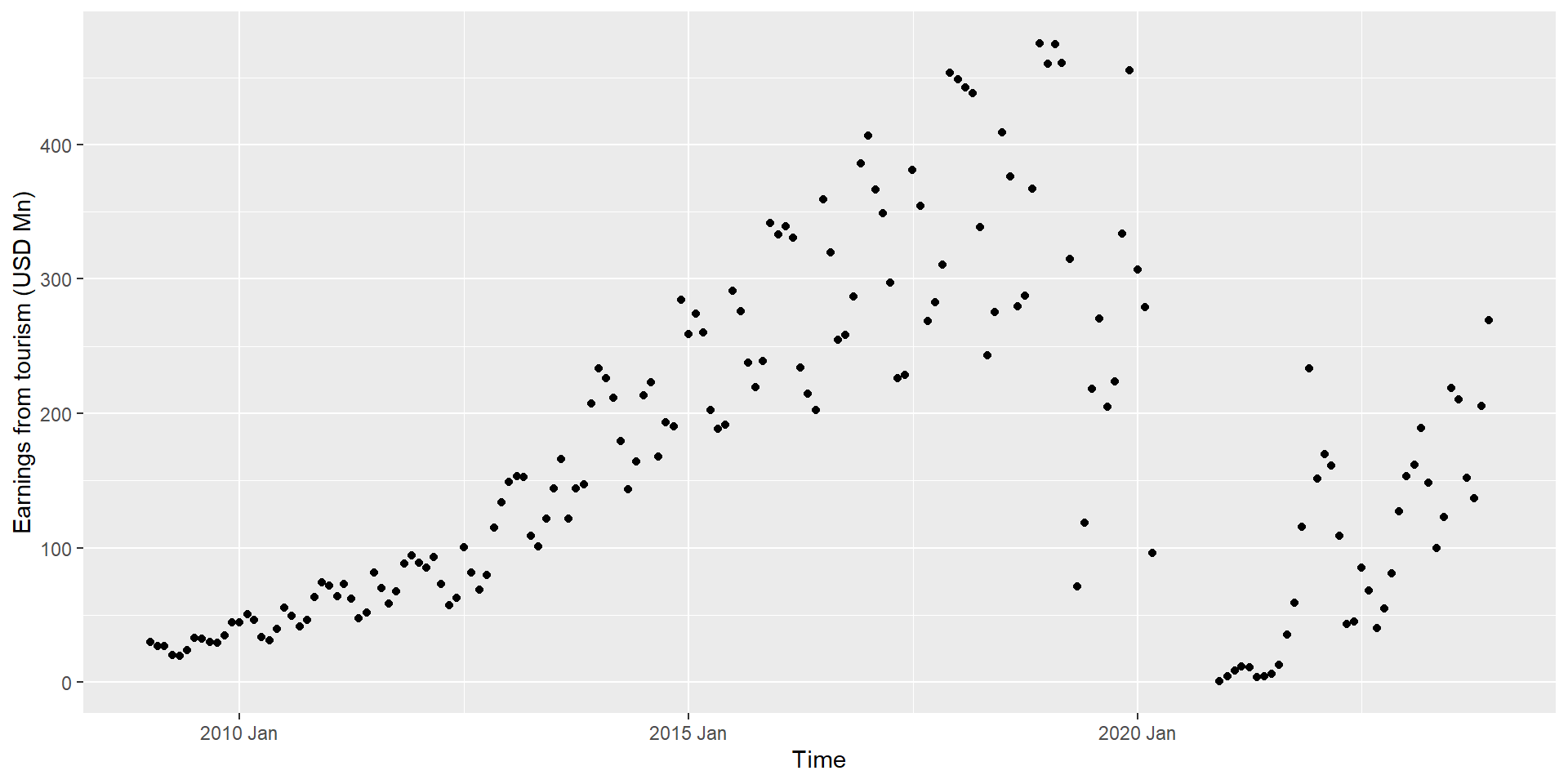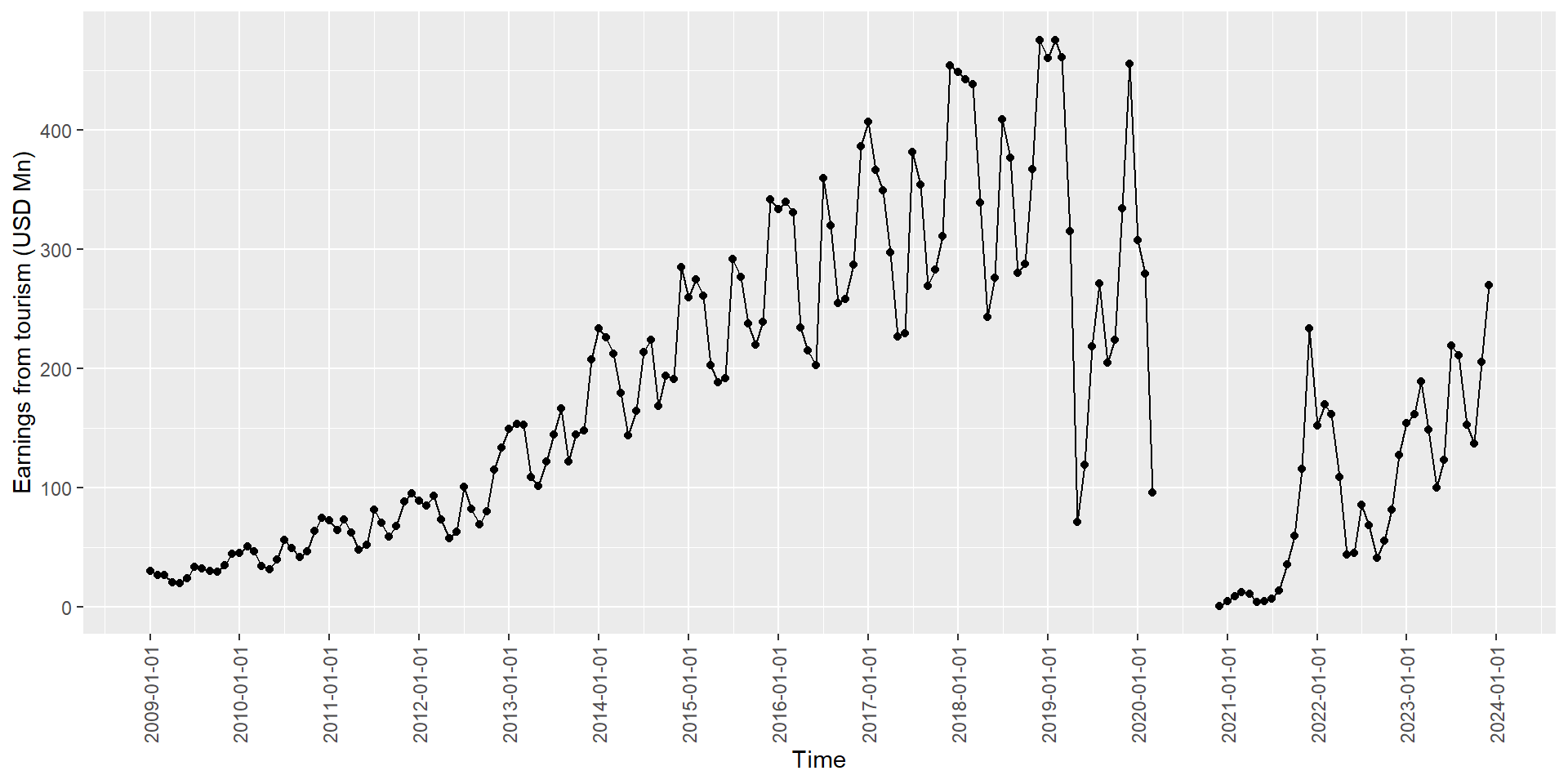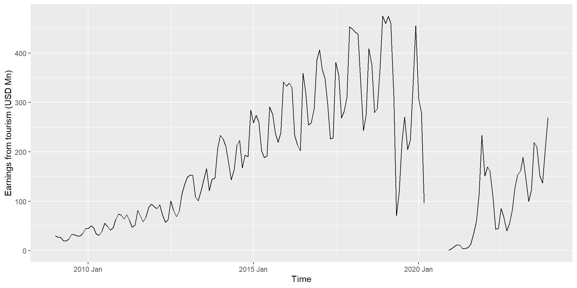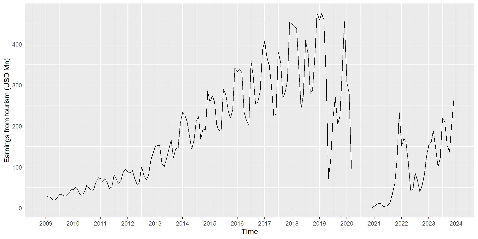 TourSriLankay.earnings <- earnings |> mutate(Date = seq(ymd_hm("2009-1-1 0:00"), ymd_hm("2023-12-1 12:00"), by = "month"))