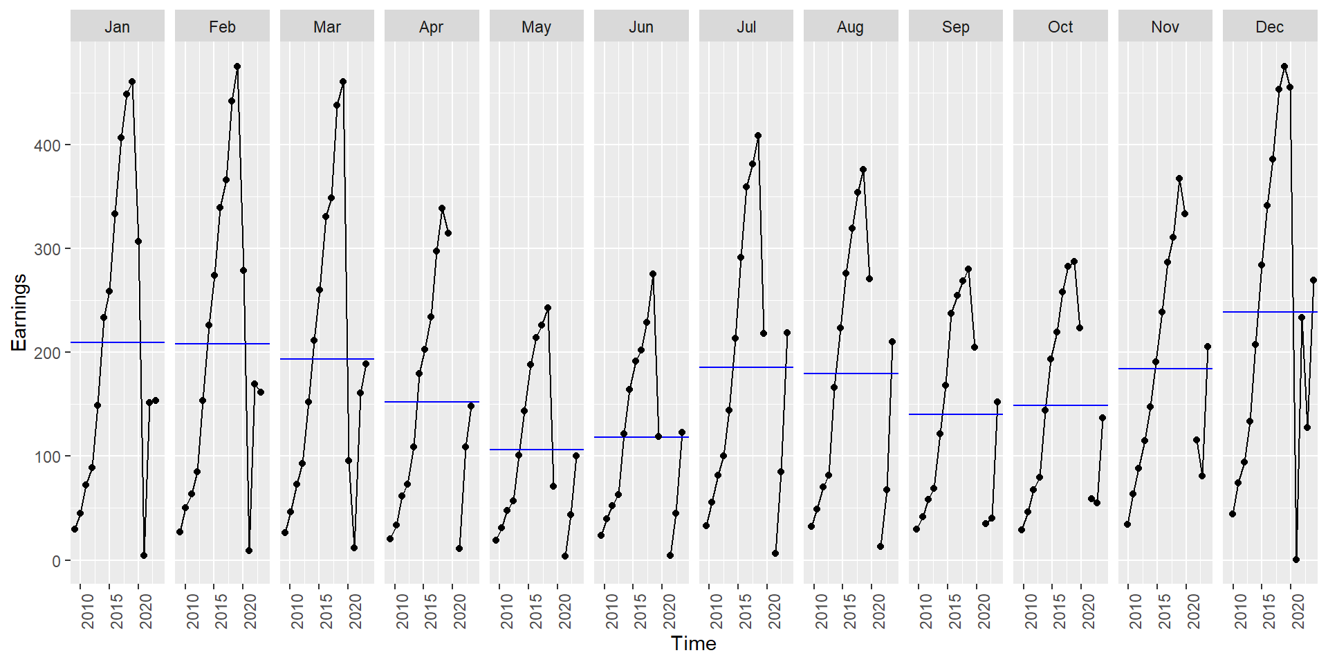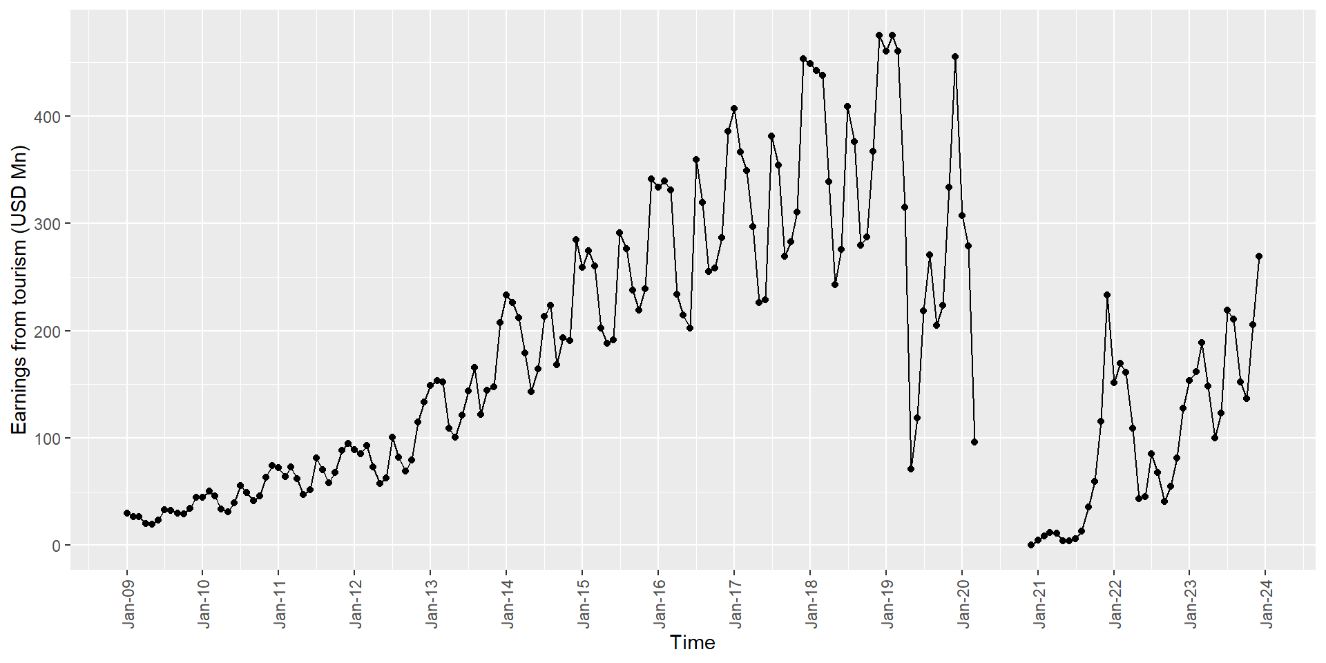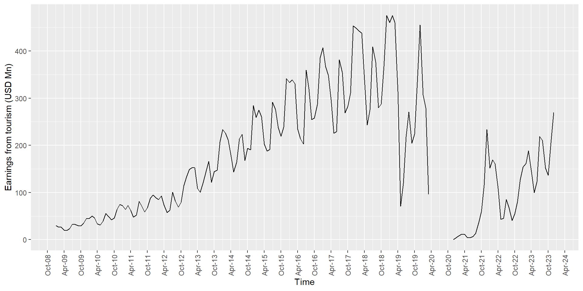 TourSriLankay.earnings <- earnings |> mutate(Date = seq(ymd_hm("2009-1-1 0:00"), ymd_hm("2023-12-1 12:00"), by = "month"))