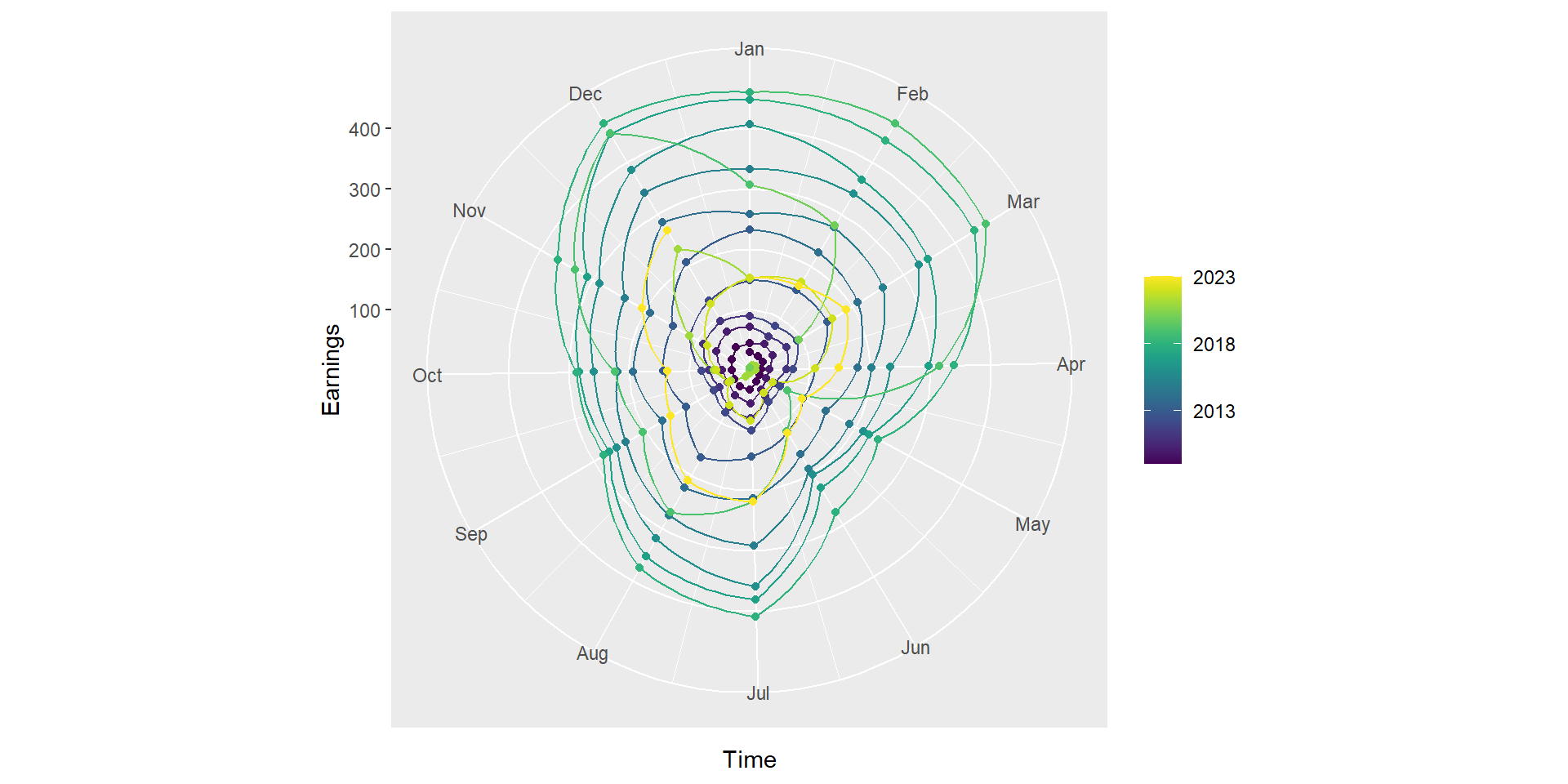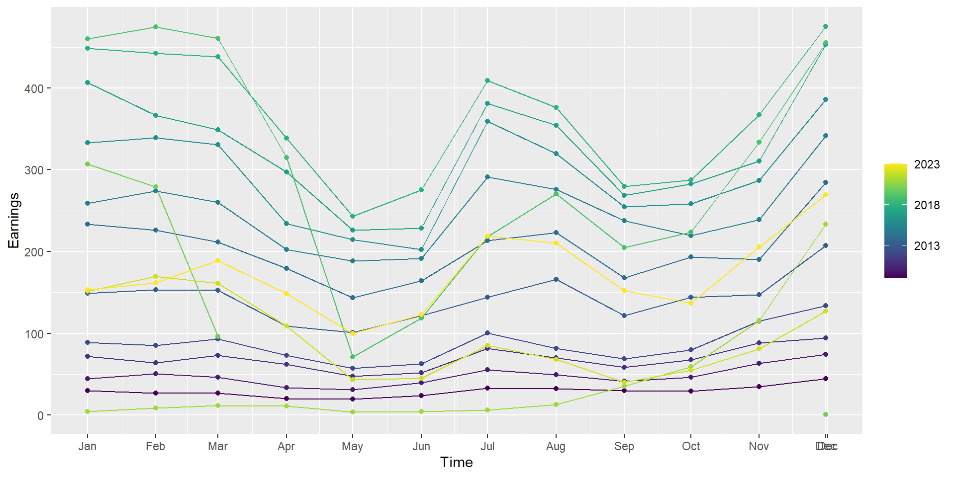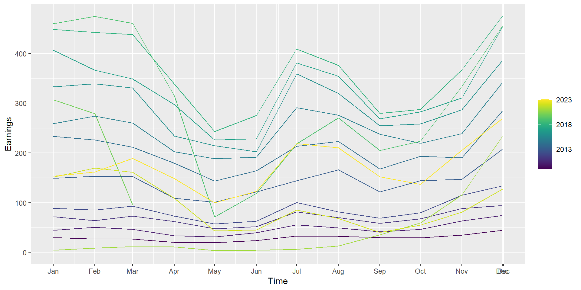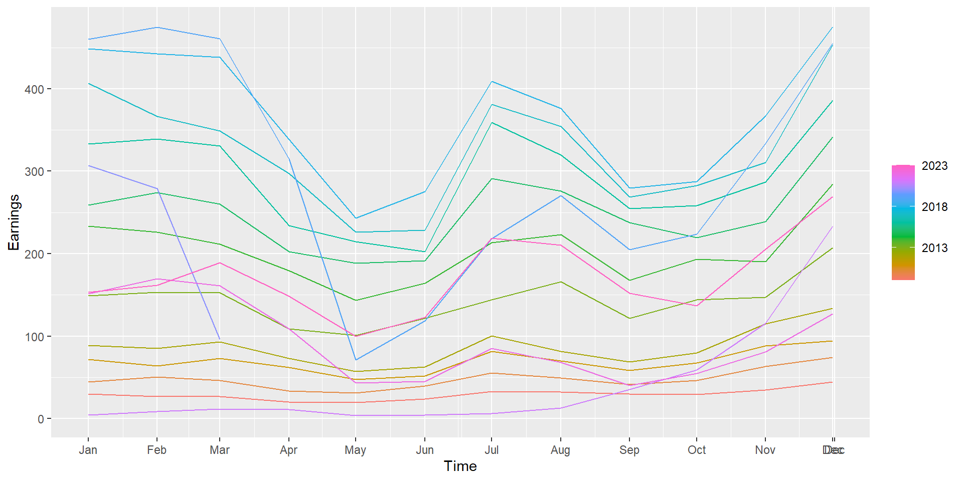 TourSriLankay.earnings <- earnings |> mutate(Date = seq(ymd_hm("2009-1-1 0:00"), ymd_hm("2023-12-1 12:00"), by = "month"))