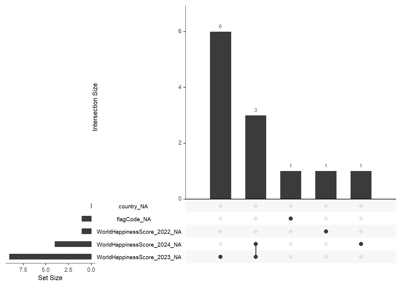 Figure 2 shows combination-wise missing values in the dataset WorldHappinessScore. There are 6 observations where only WorldHapinessScore_2023 missing and there are 3 observations where both WorldHapinessScore_2023 and WorldHapinessScore_2024 missing.
