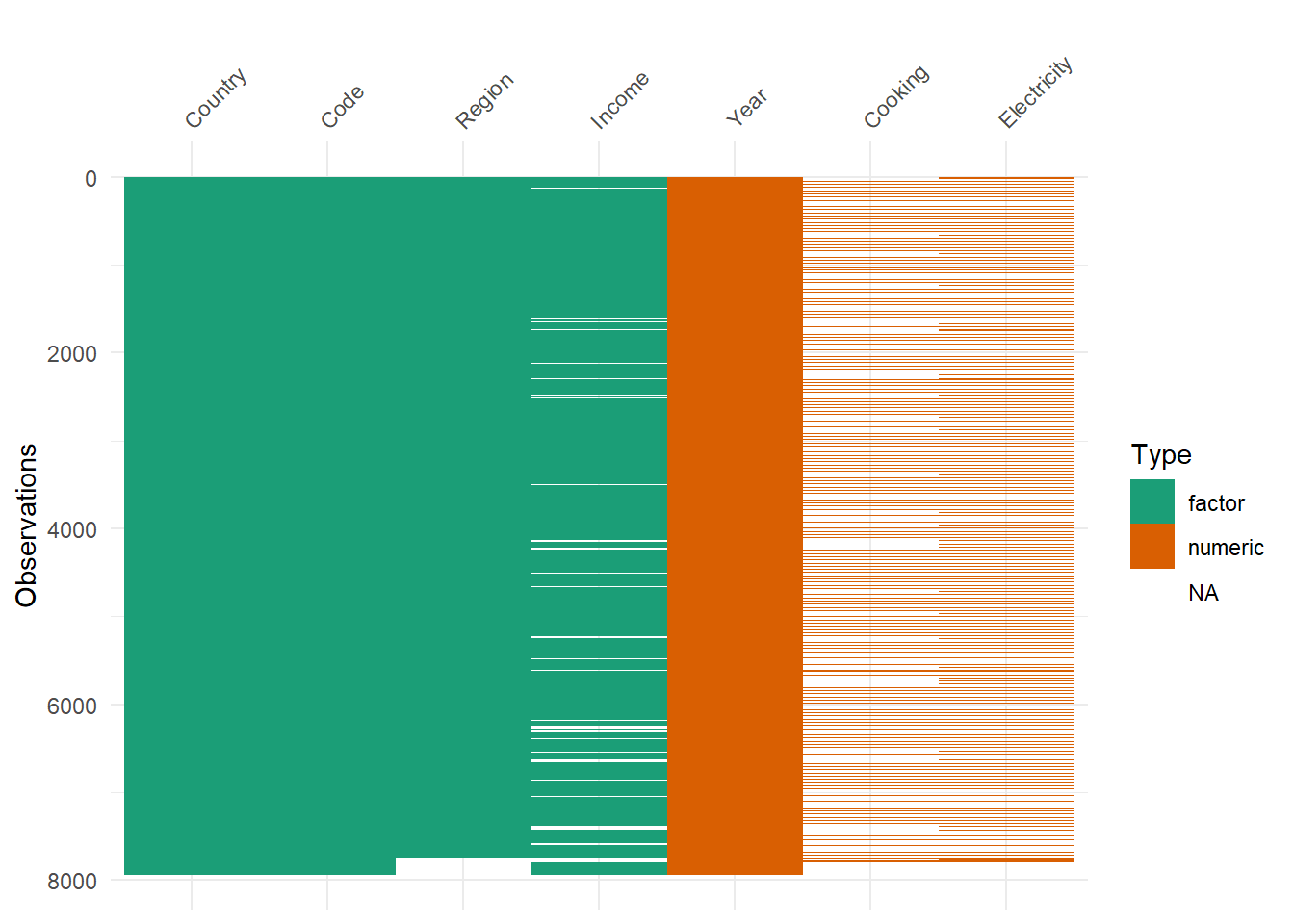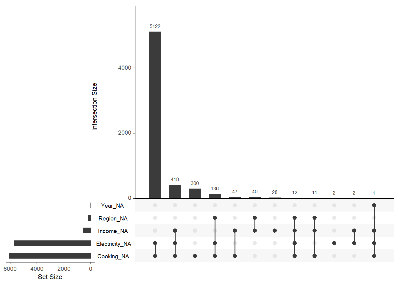Figure 4 shows combinations of missingness across cases. This is especially useful for understanding patterns of missingness across variables. For example, there are 5122 rows where both Electricity and Cooking variable missing.