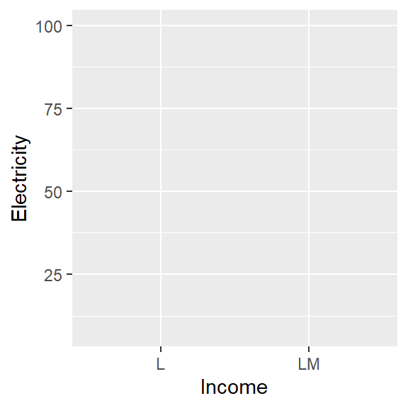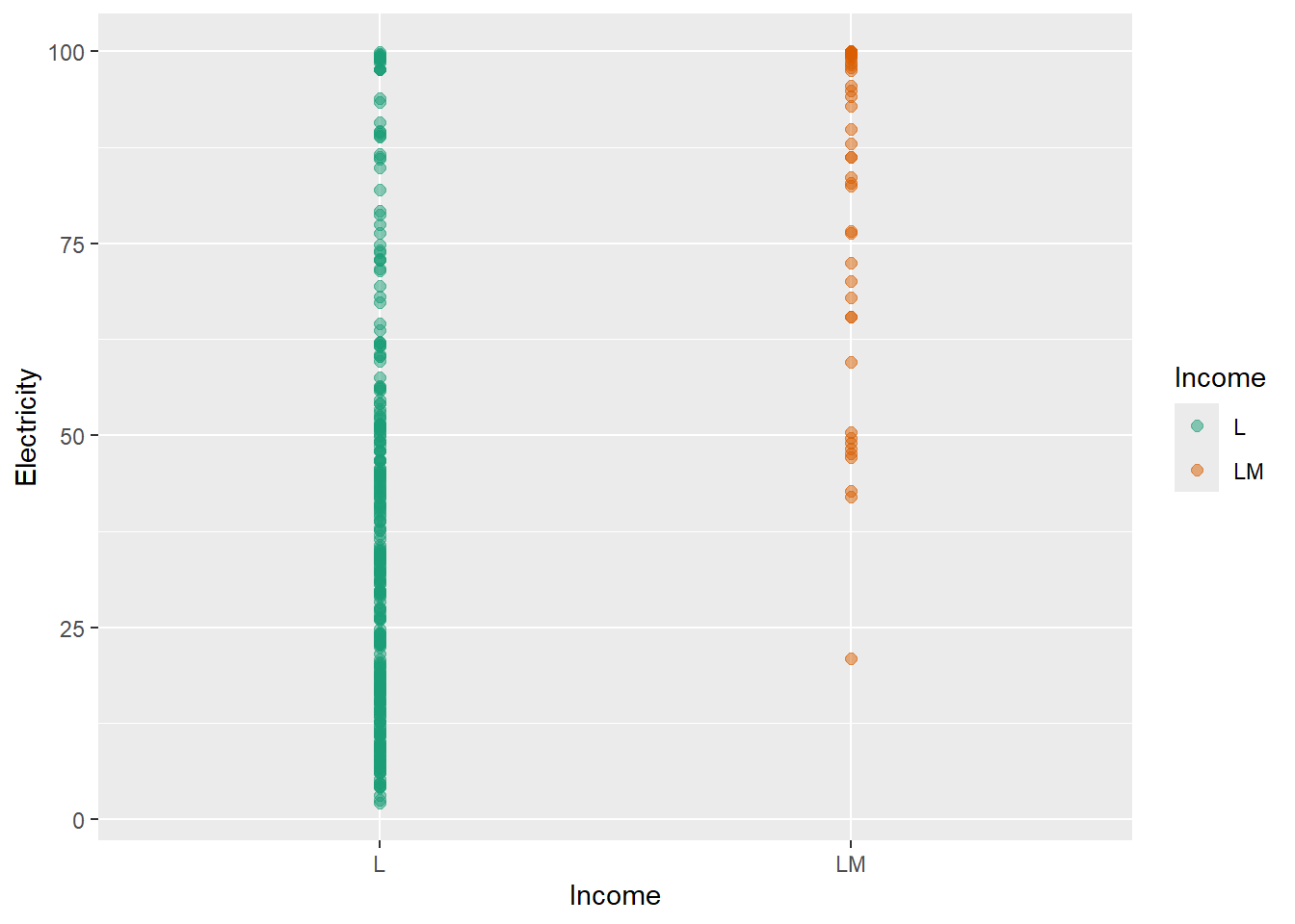 ggplot(worldbankdata2021, aes(x=Income, y=Electricity, color=Income)) +