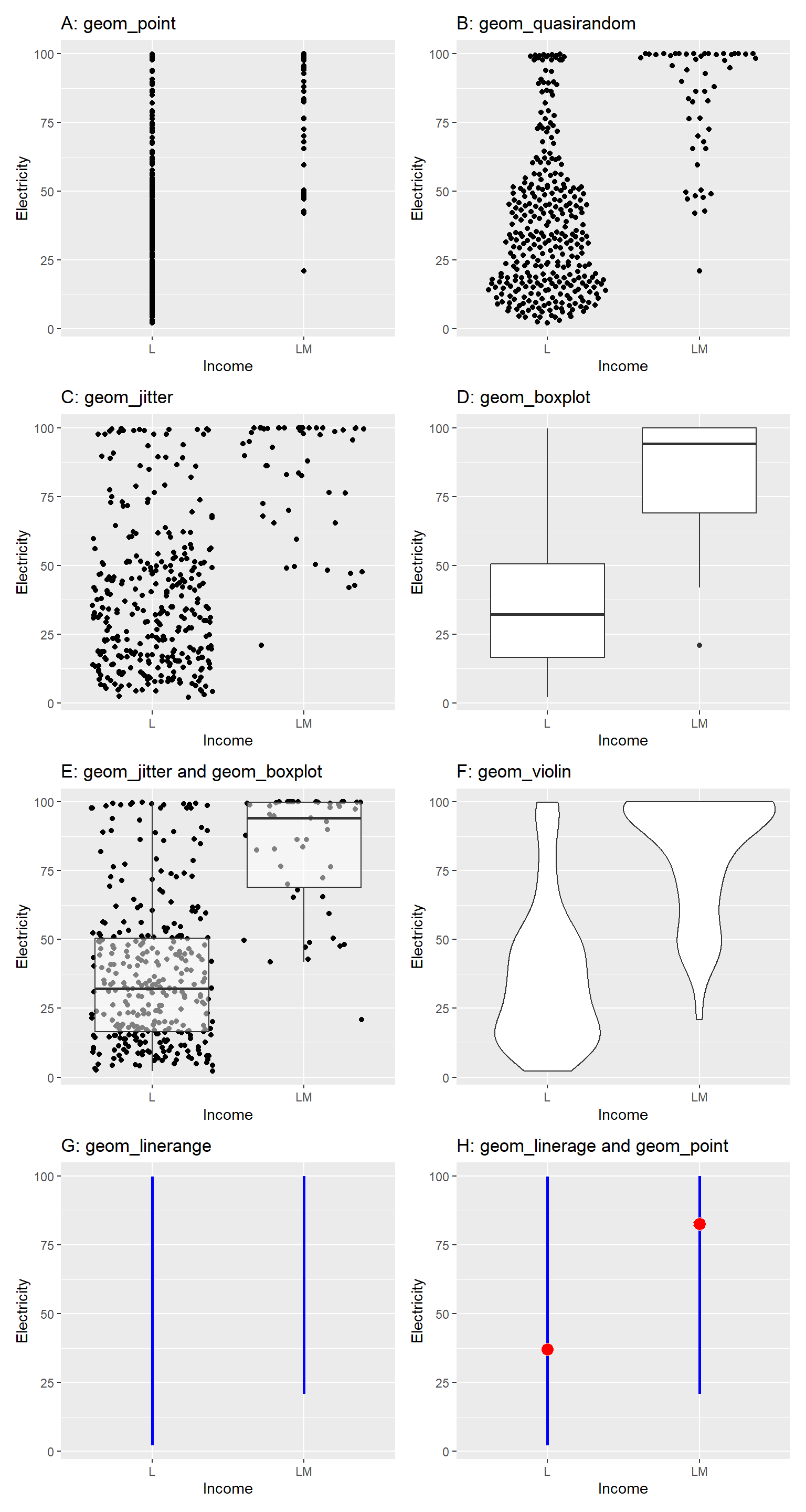 | C | Use individual data points | Jitter geometry | jitter | data is plotted as-is. But, adds a small amount of random noise to the position of points to reduce overlap and make individual points more visible |