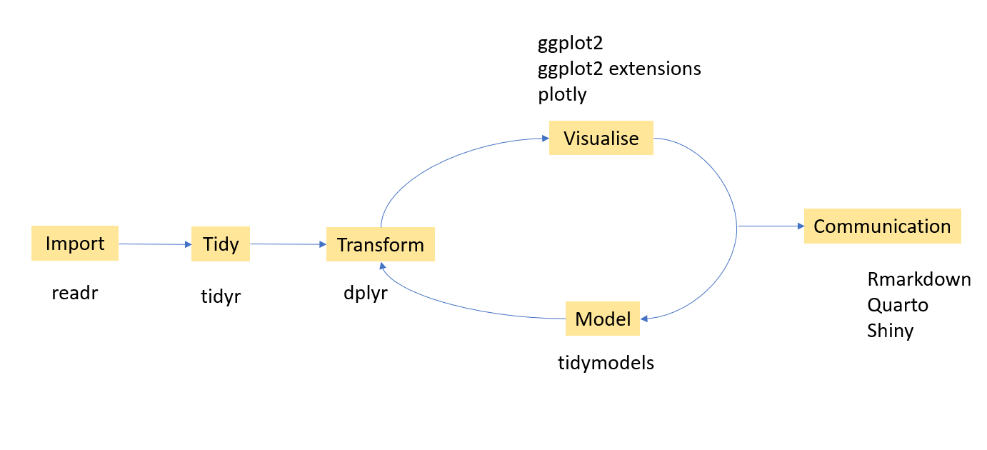 library(tidyverse) # load tidyverse packages7.3 The Tidyverse data analysis workflow