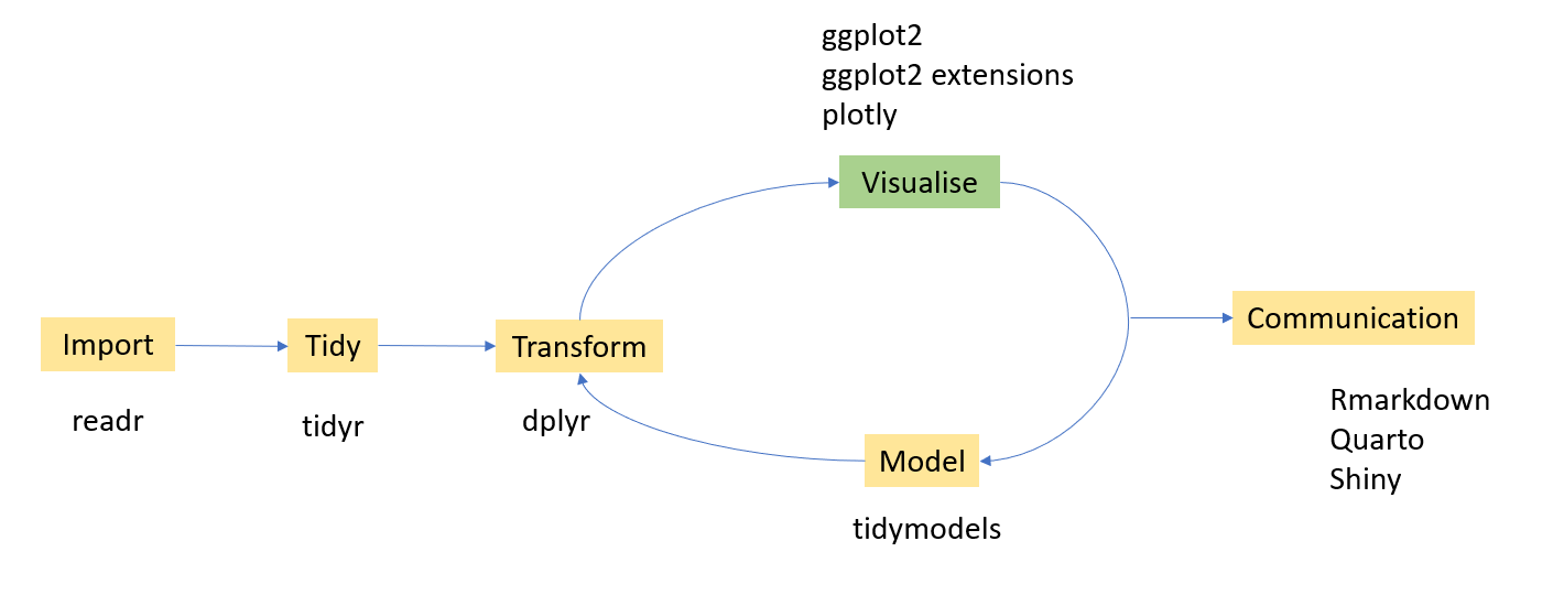 Geometries (geoms): the type of plot you draw (points, lines, bars, boxplots).