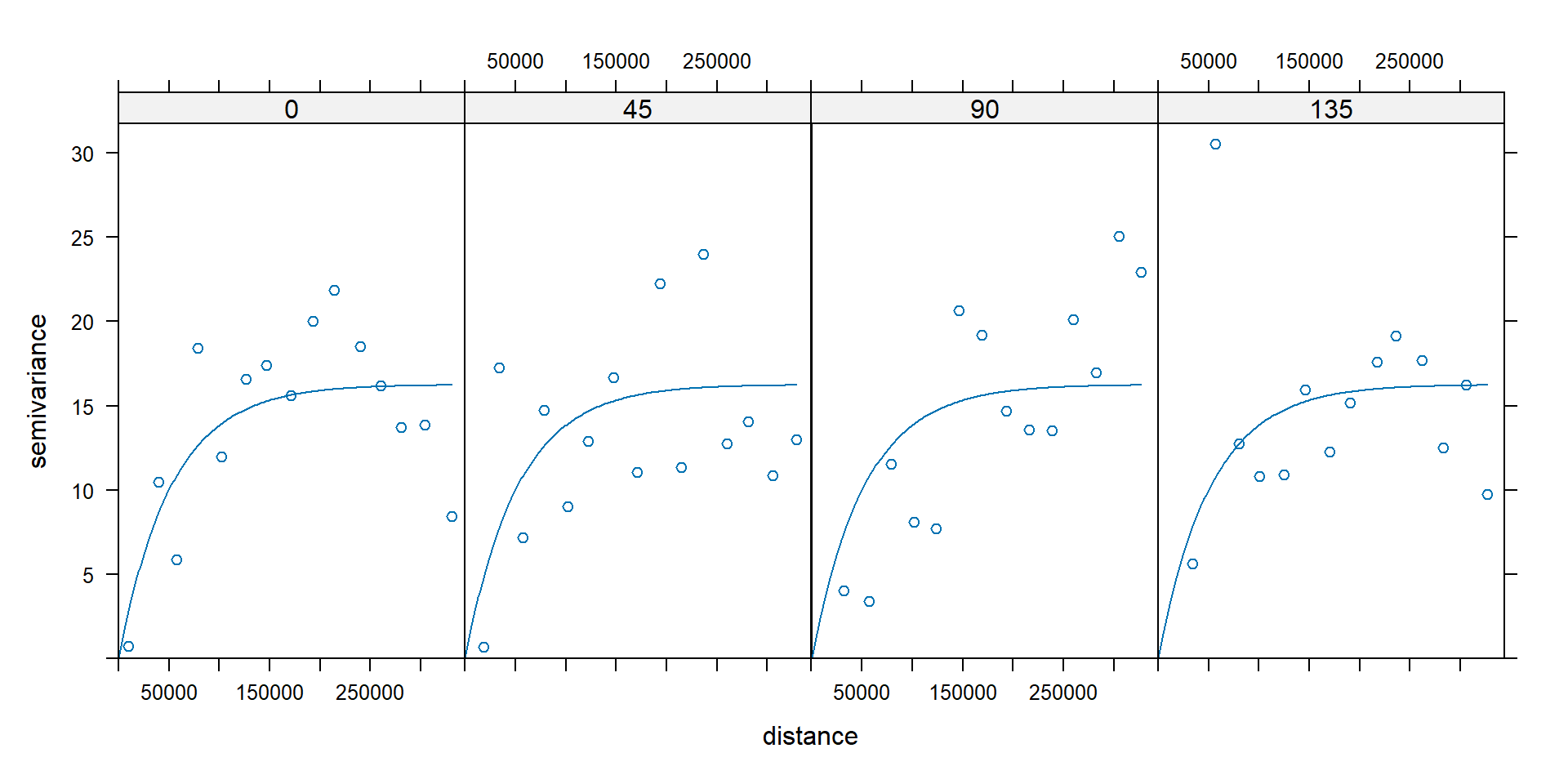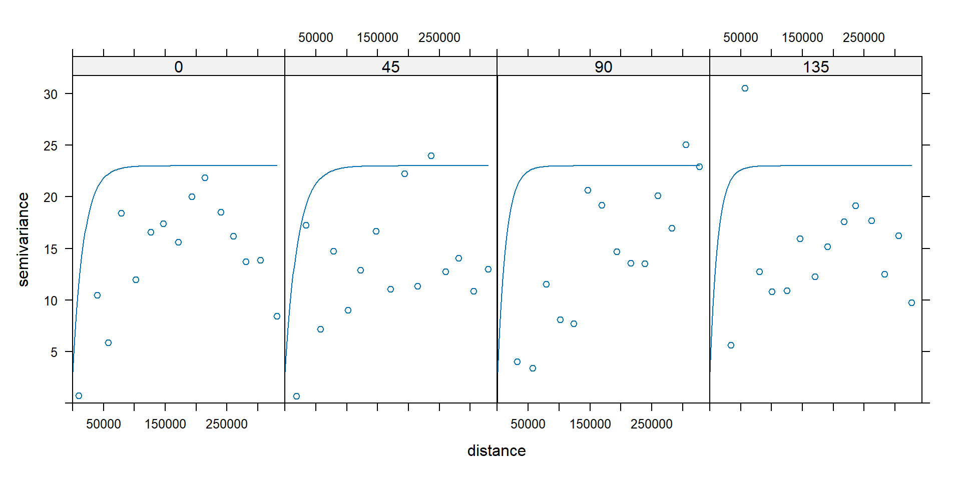 v.m.rk <- fit.variogram (v1.ani.rk, vgm (psill= 15 , model = "Exp" , range = 20000 , nugget = 1 ))