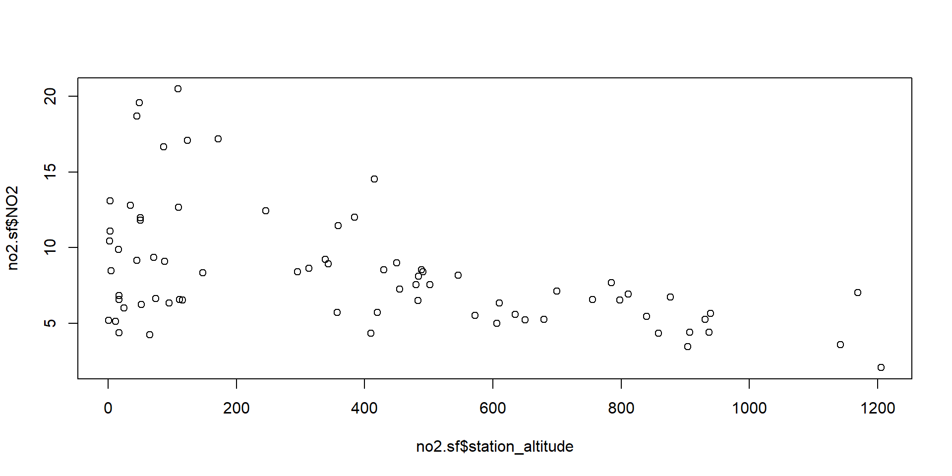 plot ( no2.sf$ station_altitude, no2.sf$ NO2,)