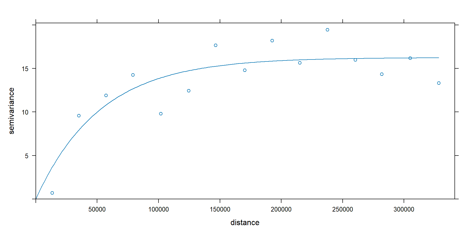 vr.m <- fit.variogram (vr, vgm (1 , "Exp" , 50000 , 1 ))
