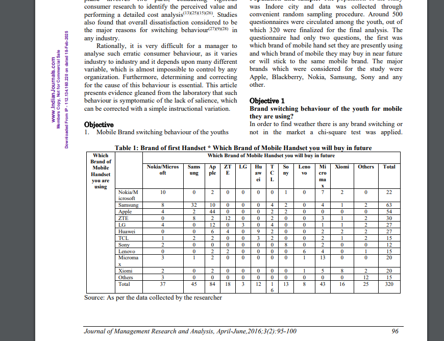 - Sharma, V., & Sonwalkar, J. (2016). Predicting the Switching Intention of Cell-Phone Brands: Application of Markov Chain Models. Journal of Management Research and Analysis, 3(2), 95-100.